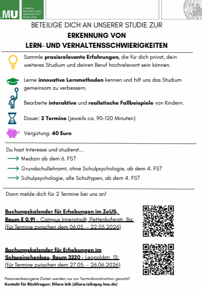 Der Zeitaufwand beträgt nur 2–3 Minuten. Ich würde mich sehr freuen, wenn ihr den Link zur Befragung über eure Kanäle (Mailverteiler, Social Media oder Gruppen, Einführungswoche) teilen könntet, um möglichst viele Studierende zu erreichen.
